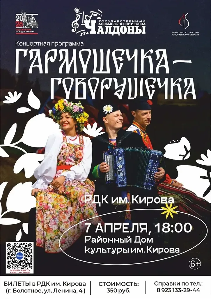 В начале апреля наш зал наполнится звуками самого родного и душевного инструмента. Государственный ансамбль песни и танца «Чалдоны» представит концертную программу, полностью посвящённую гармони — символу русской культурной жизни.